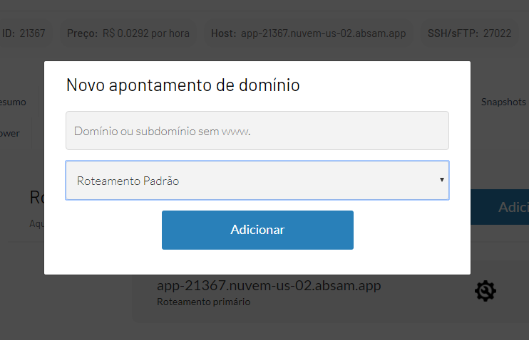 Preencha o seu domínio e depois o Host ou IP do seu servidor e clique em “Adicionar“