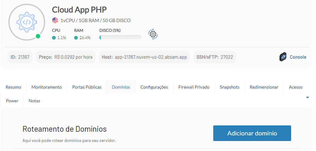 Primeiro passo é estar logado no painel, logo em seguida abra seu Cloud App ou Cloud Nat que deseja apontar um domínio personalizado e clique no link Domínios no menu central.