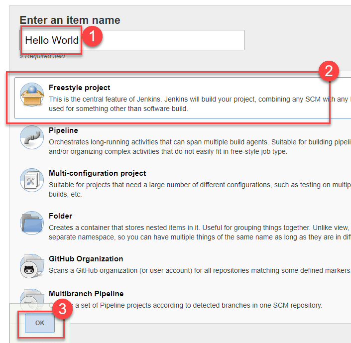 Você pode montar incialmente um job “construir um projeto de software free-style”, primeira opção da lista de jobs, que pode montar um jenkis para seu projeto do git.