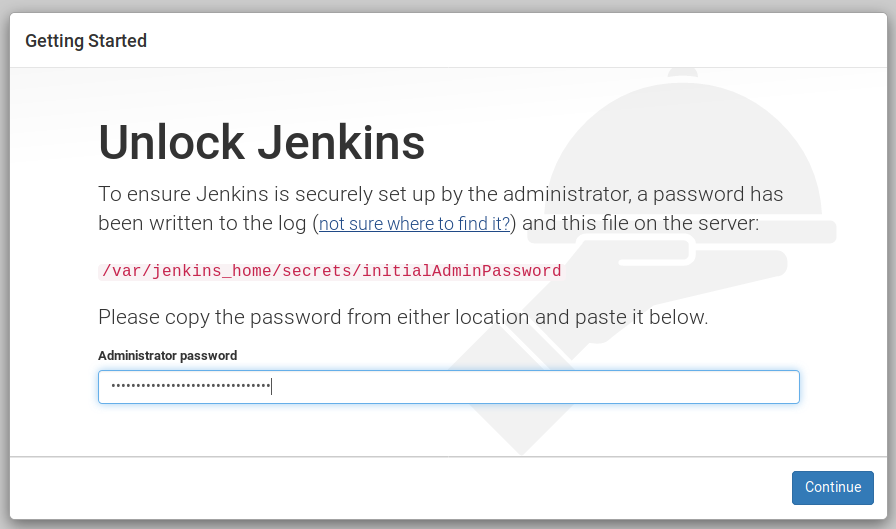 Em seguida para rodar: > docker run -p 8080:8080 -p 50000:50000 jenkins/jenkins:lts Pronto! jenkins esta instalado e rodando na porta 8080 do seu servidor Cloud Server, para acessar vá ao navegador e acesse pelo endereço ip do seu servidor dessa forma: http://<endereco_ip>:8080  Ao acessar a primeira vez o endereço ele ira solicitar uma chave para password do administrador, a qual você poderá adquirir no local indicado na tela por ele.