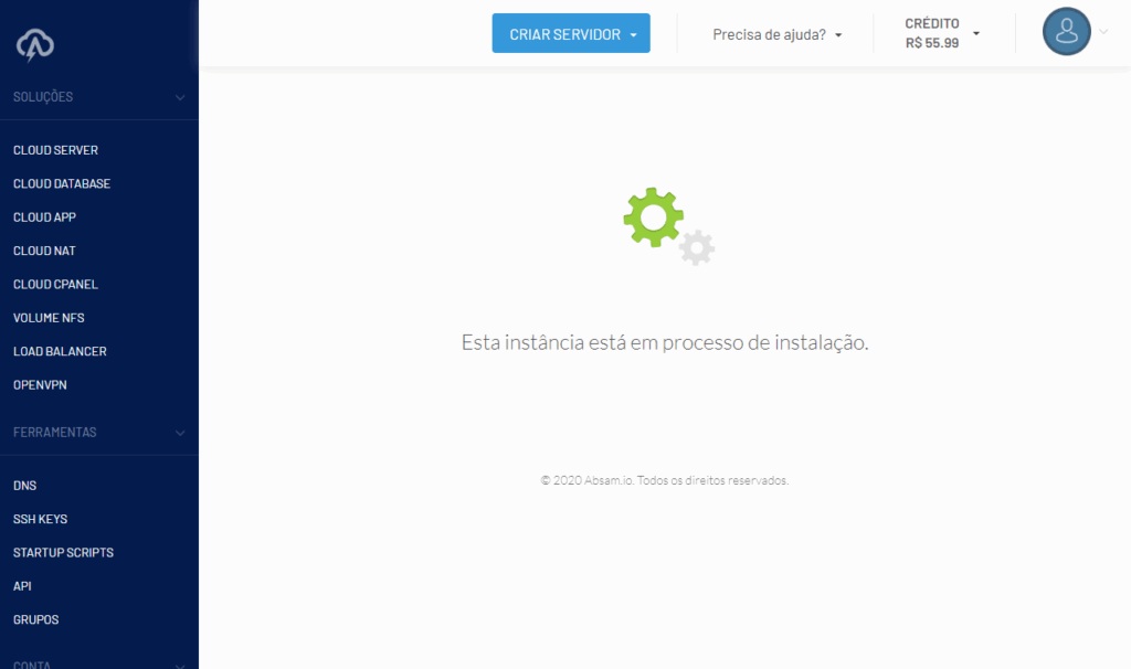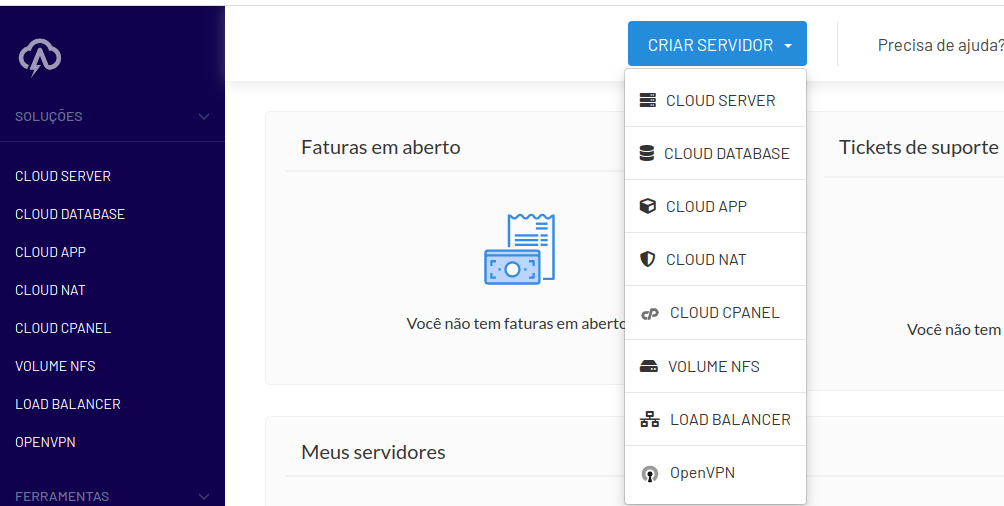 Estando logado no sistema, no menu principal clique em Criar Servidor > Cloud App